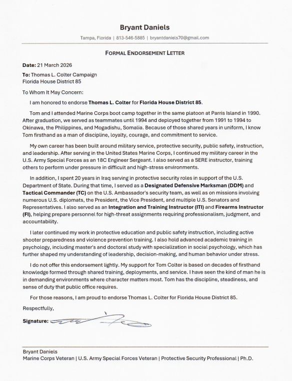 Bryant Daniels is a military veteran, U.S. Army Special Forces veteran, protective security professional, instructor, and public safety educator. He attended Marine Corps boot camp with Tom Colter at Parris Island in 1990, served as his teammate until 1994, and deployed with him to Okinawa, the Philippines, and Mogadishu, Somalia. Bryant later spent 20 years in Iraq in protective security roles supporting the U.S. Department of State, including service on the U.S. Ambassador’s security team. His endorsement is grounded in decades of firsthand experience with Tom’s leadership, discipline, and service.